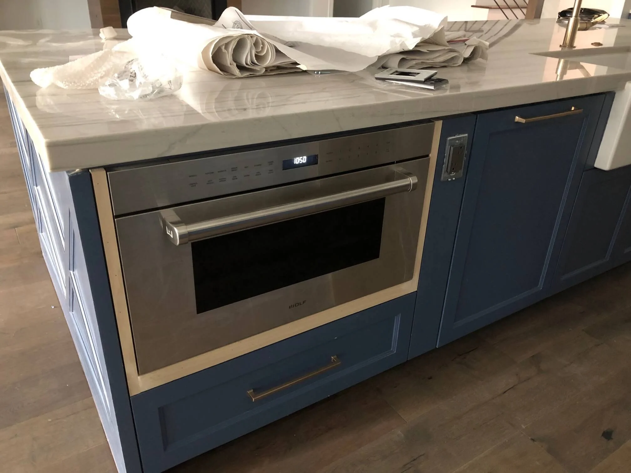 Blue kitchen island almost complete. Legrand Adorne paintable outlet cover plate is being installed to blend into the blue of the cabinetry.