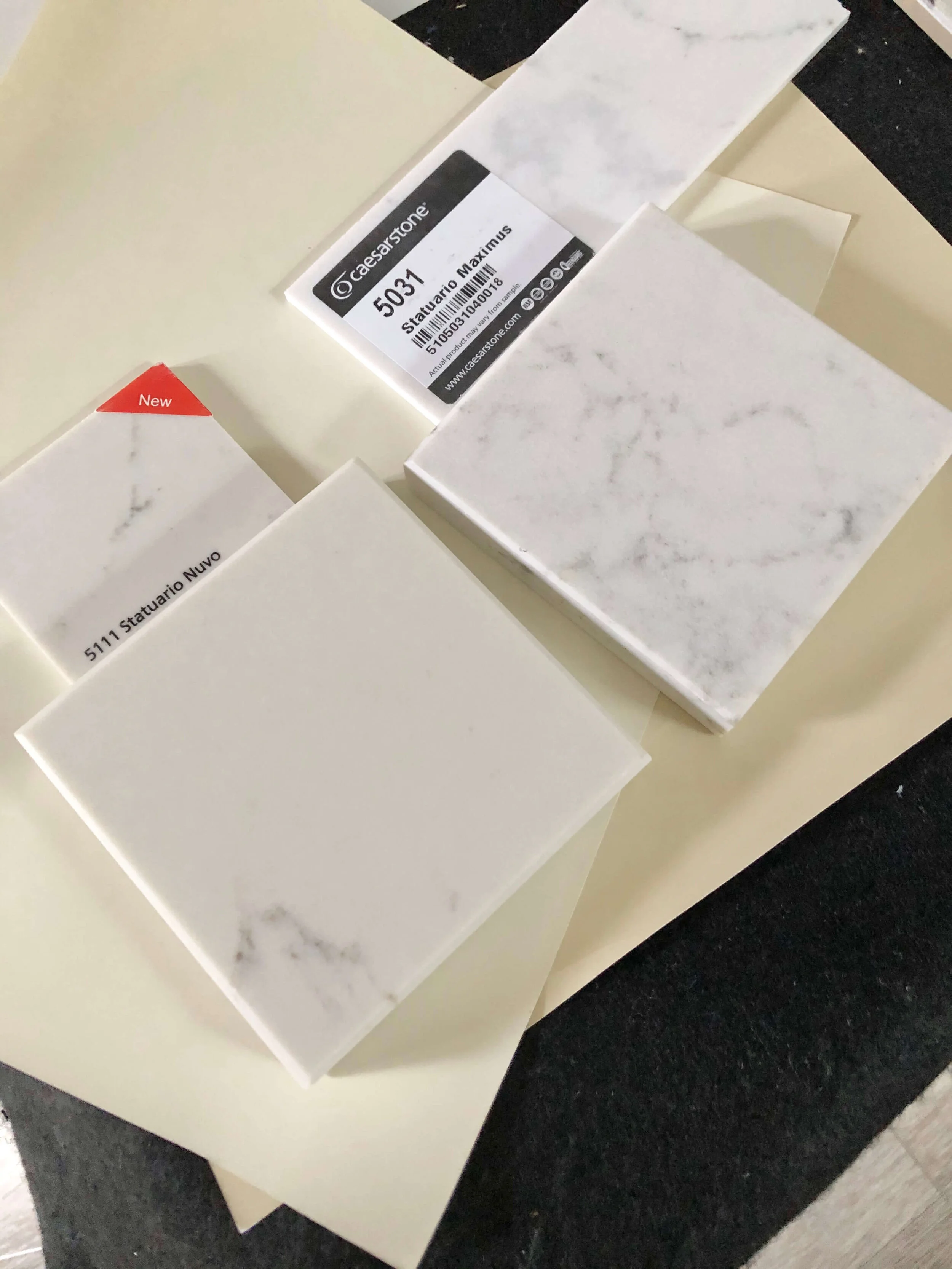 This paint color is SW Believable Buff, a really yellow white. The homeowner who used my Designed in a Click service wanted a “white look” quartz with these paint colors she had in her kitchen. This quartz from Caesarstone, Statuario Nuvo, looks good because of its warmer tone overall. You can see it compared to a whiter look quartz of theirs, Staturario Maxiumus, which would make the paint color appear even more yellow if used.