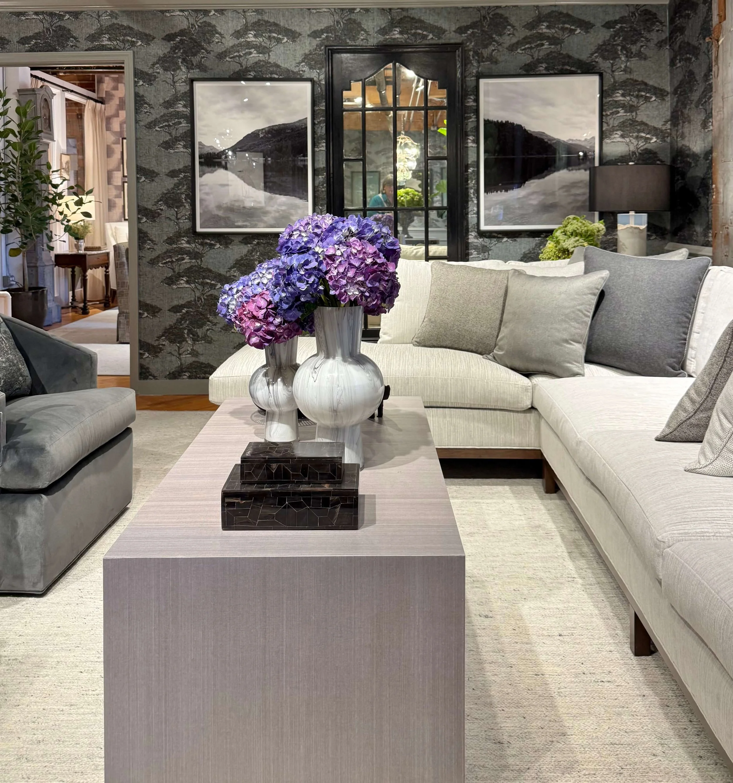A pair of boxes stack neatly on a coffee table in the Thibaut showroom at HPMKT.