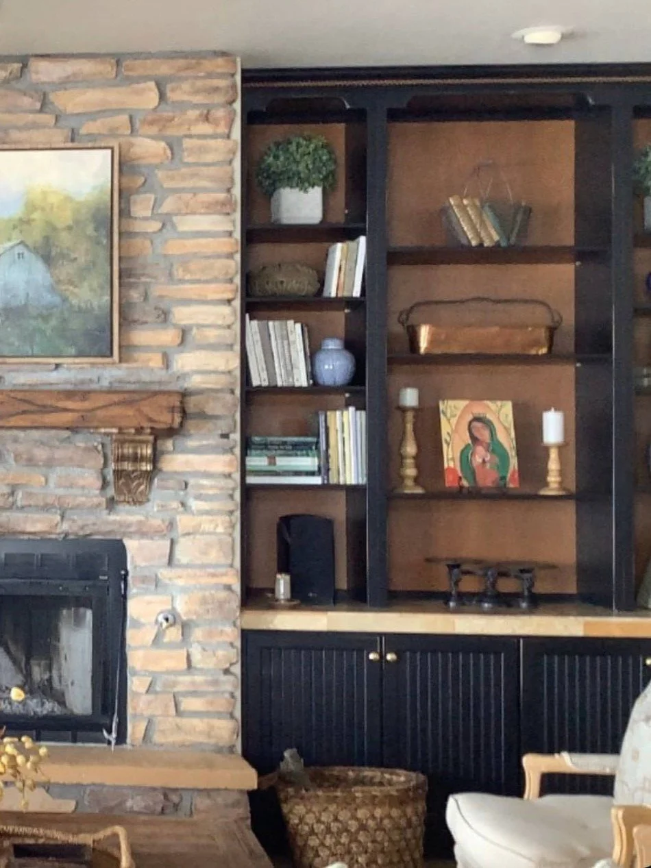 I didn’t have much left to use for styling in this home’s bookcase, below, as it was mostly packed up for moving.