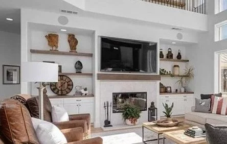 Using only new decorative pieces tends to look like a showroom or furniture store. Bookshelves are perfect places to add personality in your home, so I would not neglect to do that by adding in favorite books, collections or art.