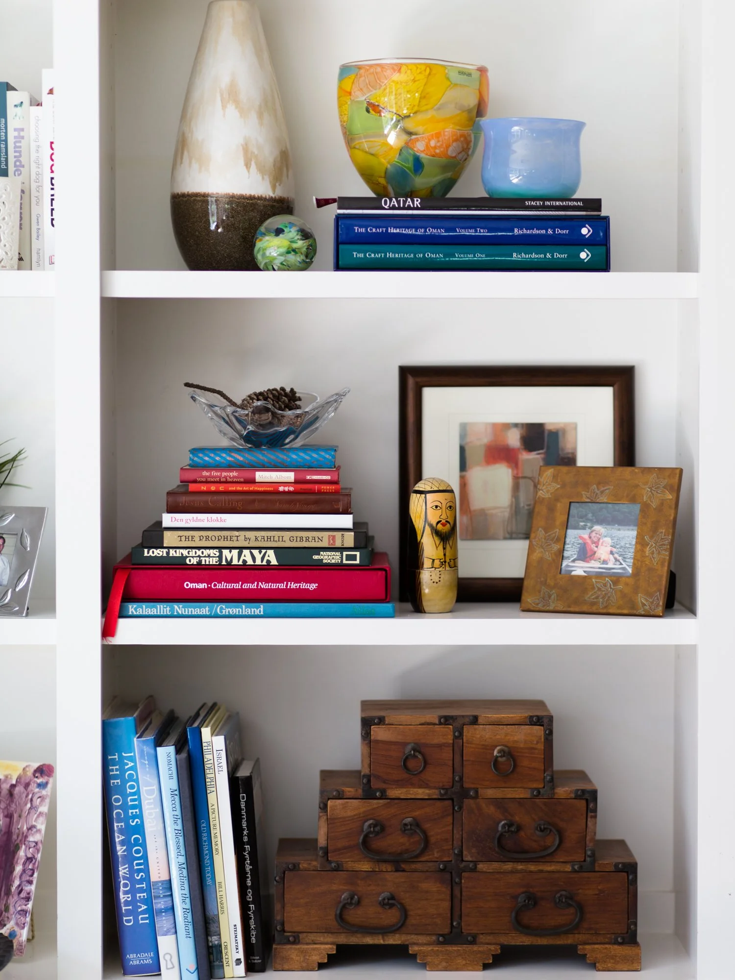 Even if your bookshelves are stuffed with books, you can do things like hang a small piece of art on the front face of a shelf or pop in small items on top of a stack of books.