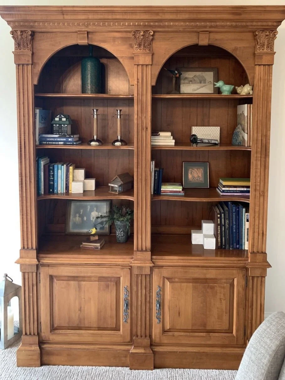 I was sent this pic of a traditional Hooker Furniture bookcase and asked about how to style this to look a bit more fresh.