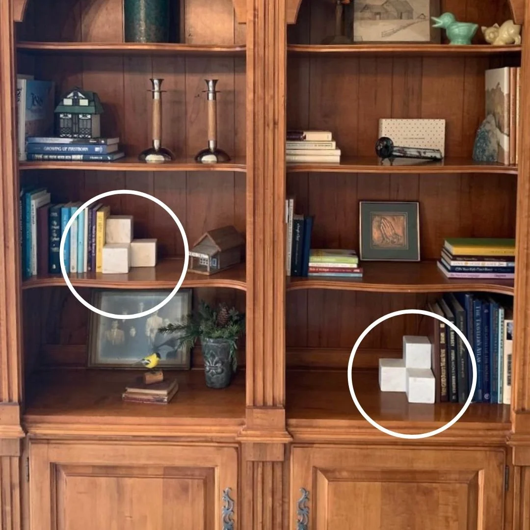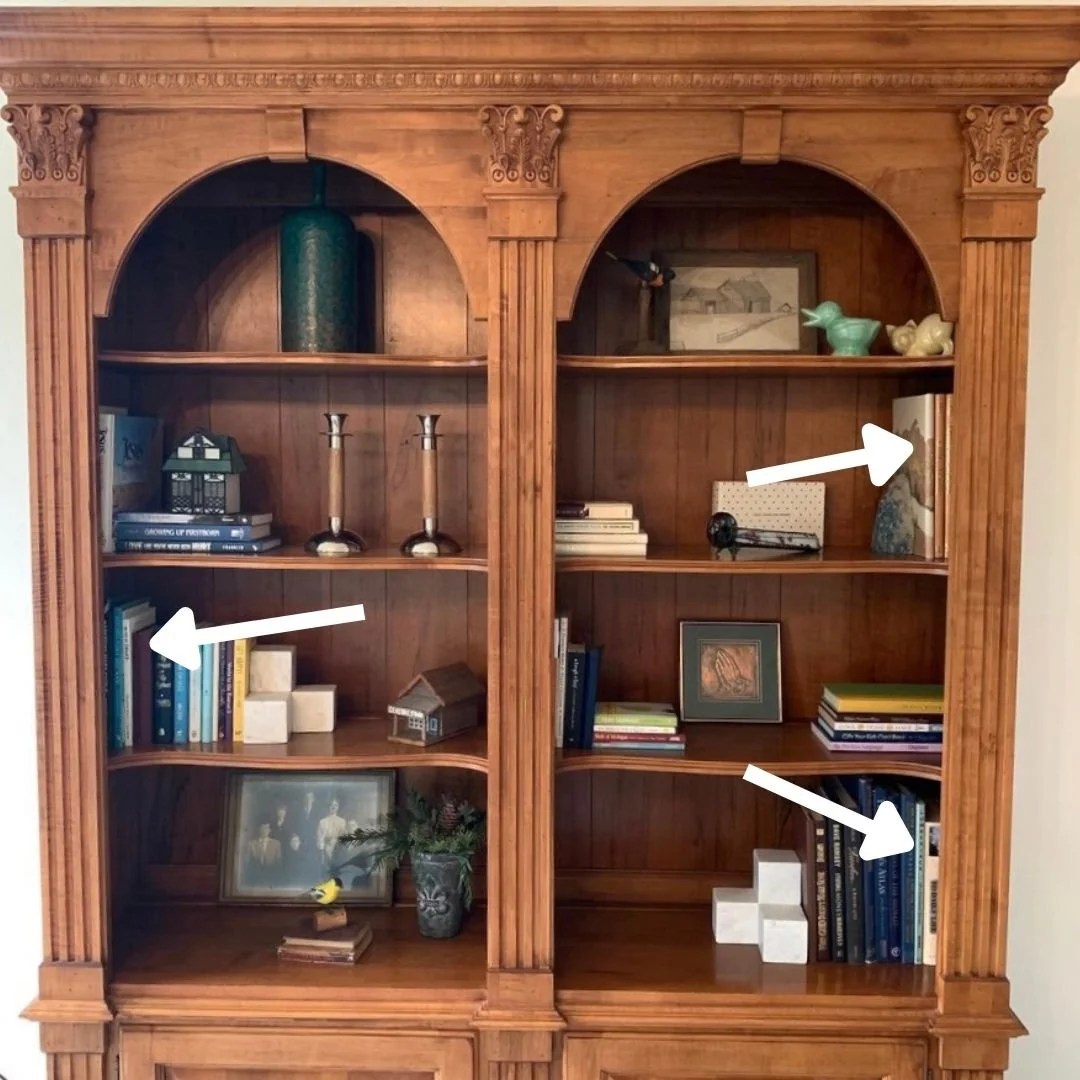 I recommended the white square bookends move elsewhere for this bookcase. They are too modern and too white for the style and aesthetic of the furniture and other objects. They just distract the eye a bit.