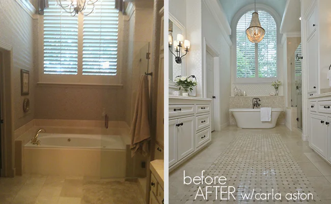 We kept the basic cabinetry, some of the tile (which we cut into the marble tile floor to insert the mosaic), and even the shower enclosure.