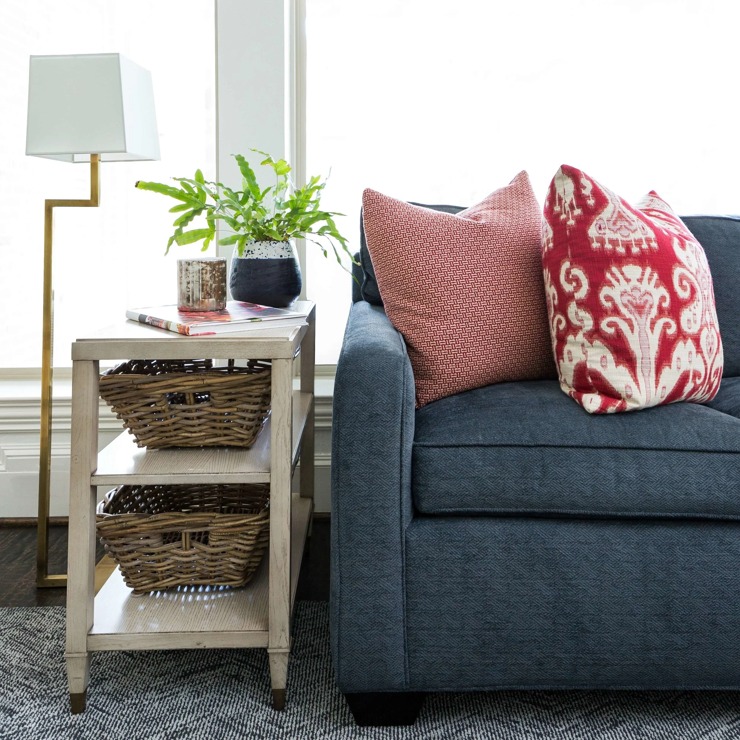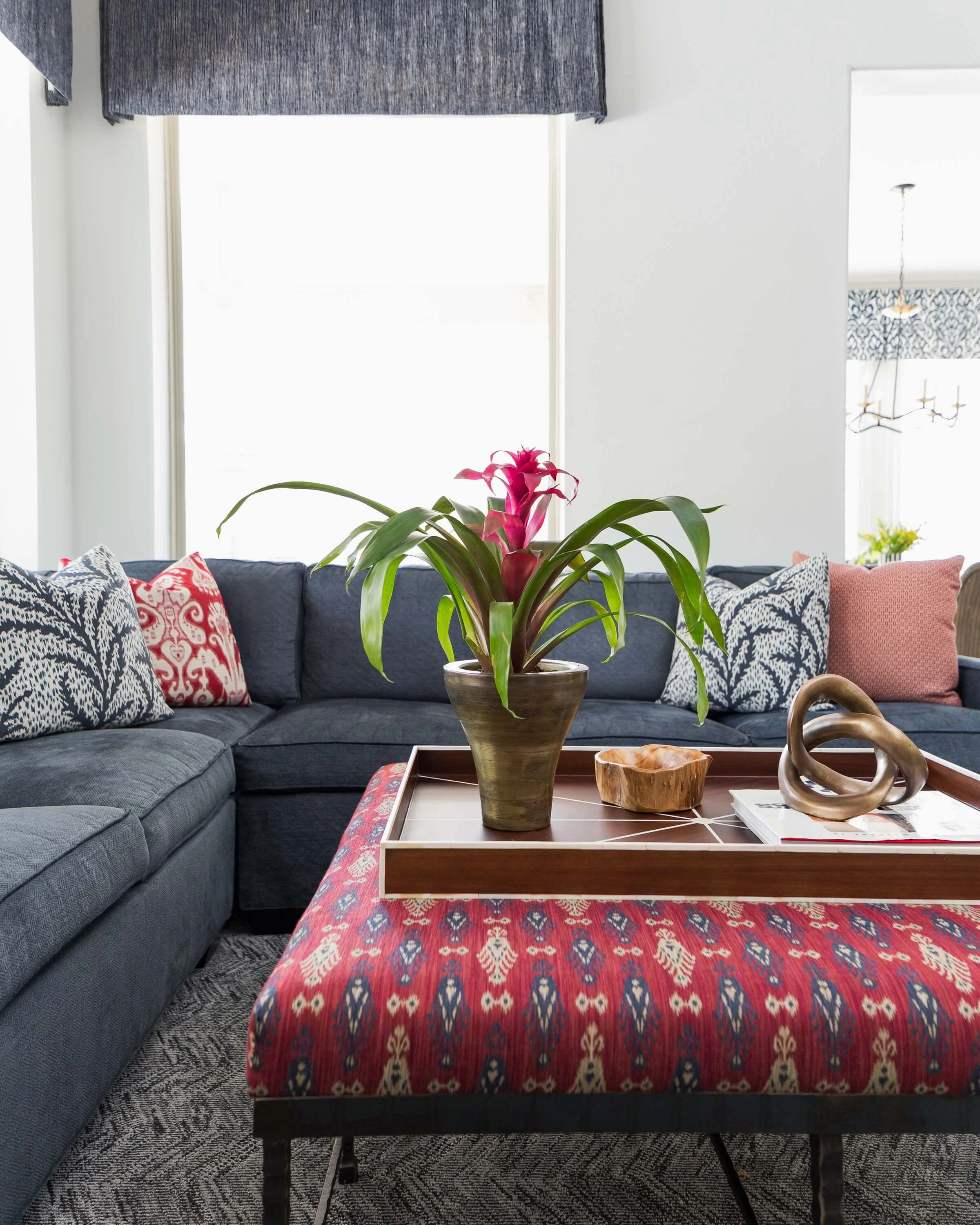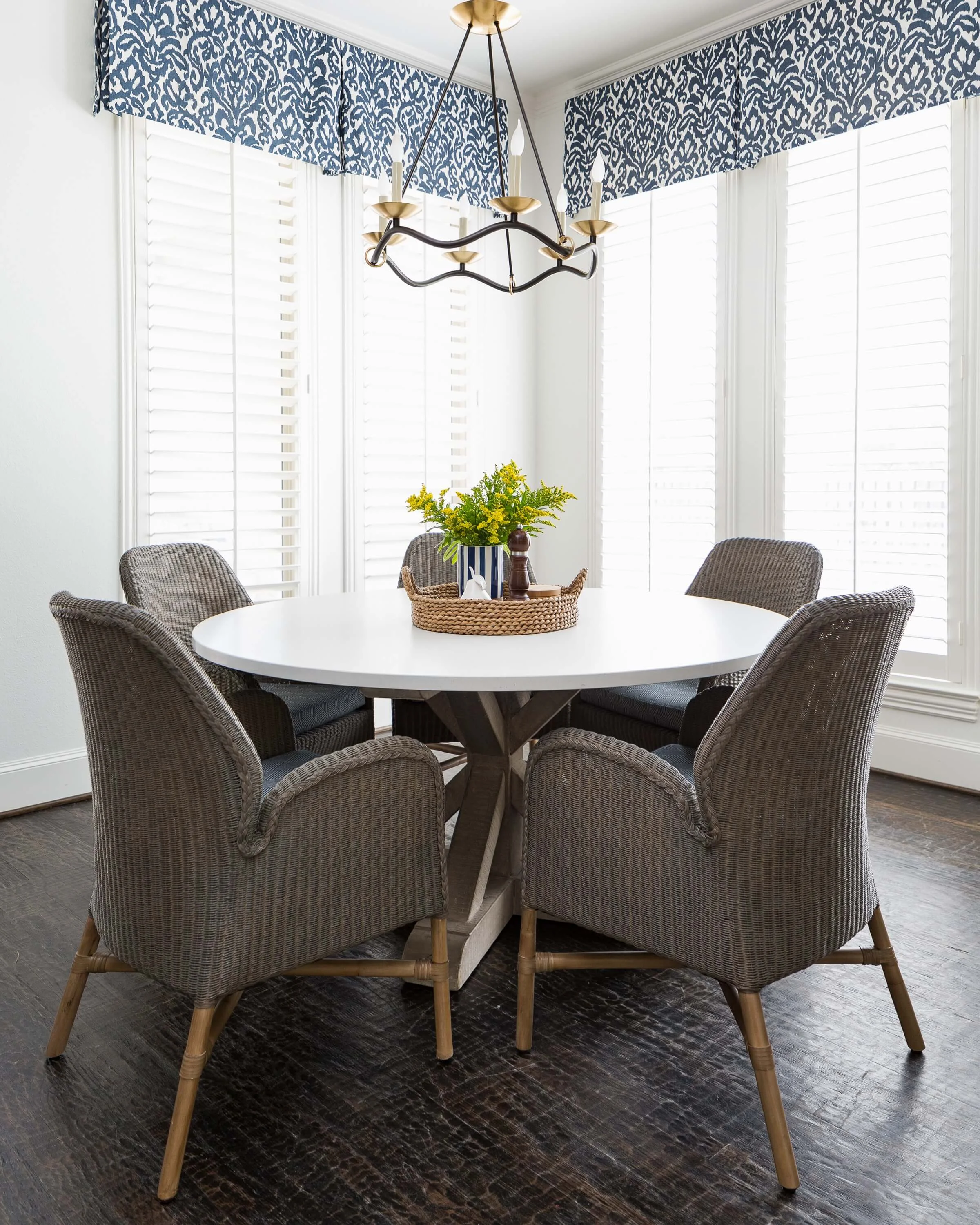 The navy and white color scheme was brought into this space too, with some textural quality in the rug and window valances.