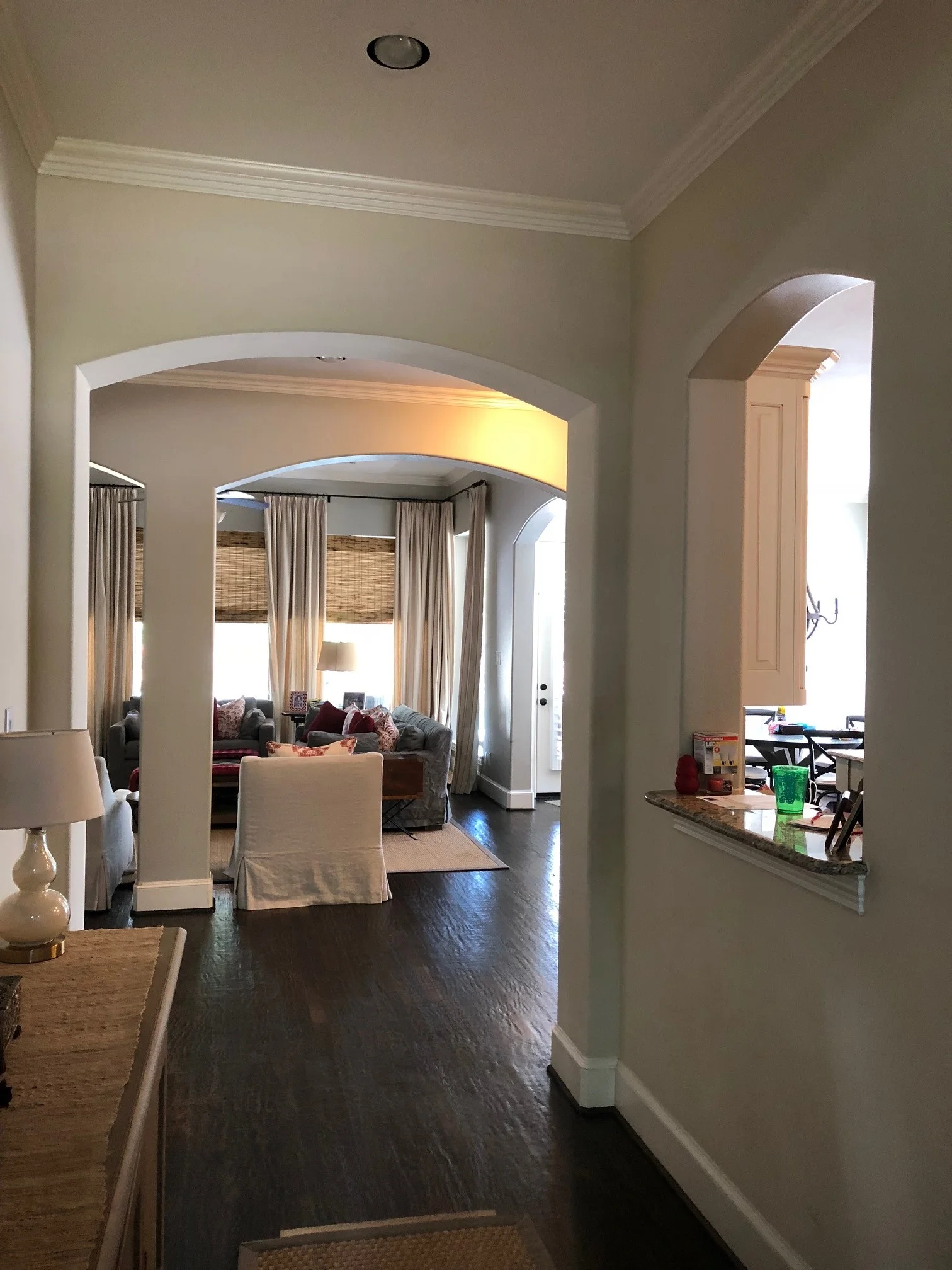 The adjacent living room had a big column that interrupted the space and arches were again, a little dated and overbearing.
