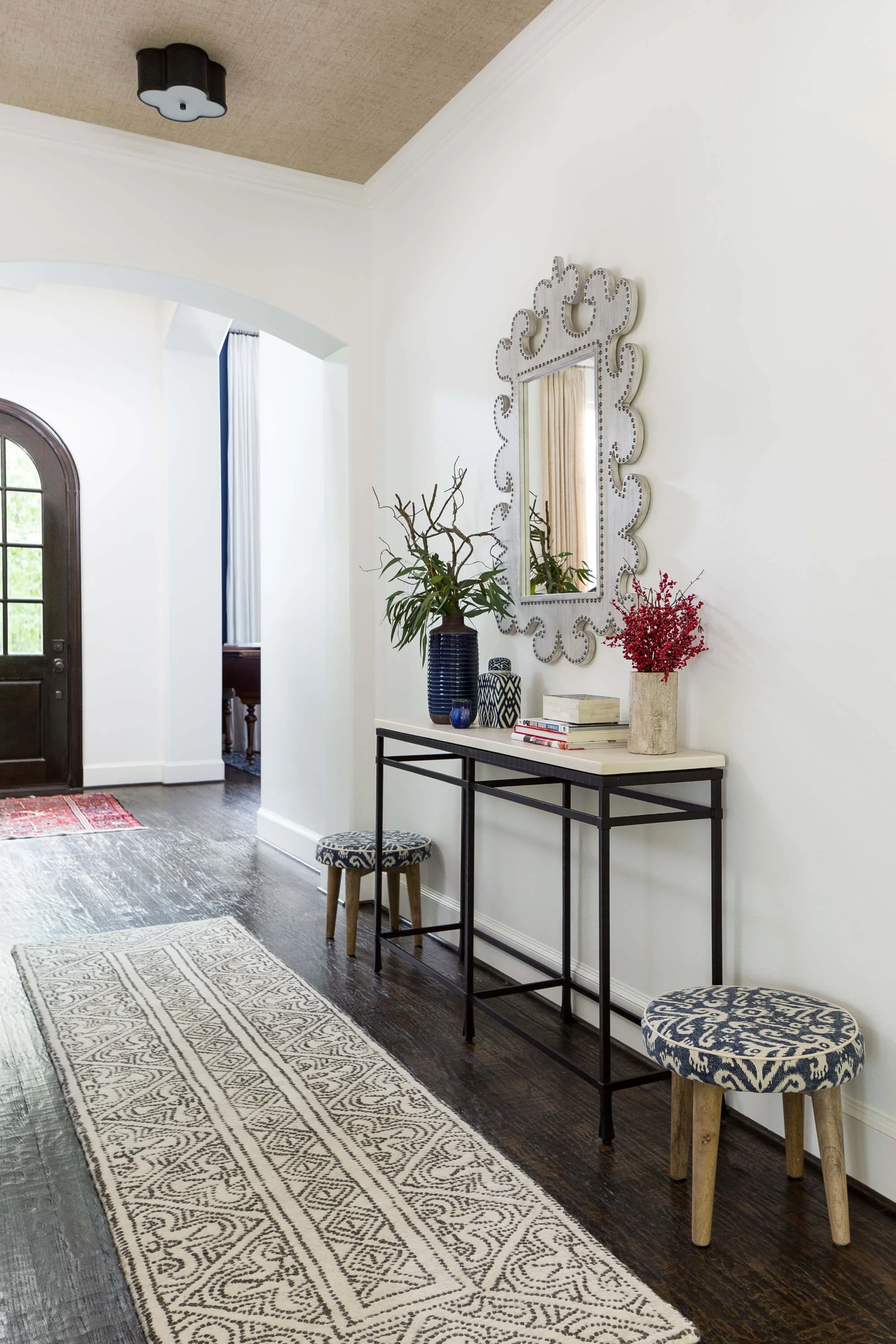 The hallway with textural wallcovering on the ceiling, new console, mirror, rug and surface mount light fixtures. | Carla Aston, Designer | Colleen Scott, Photographer #hallway #hallwaydecor