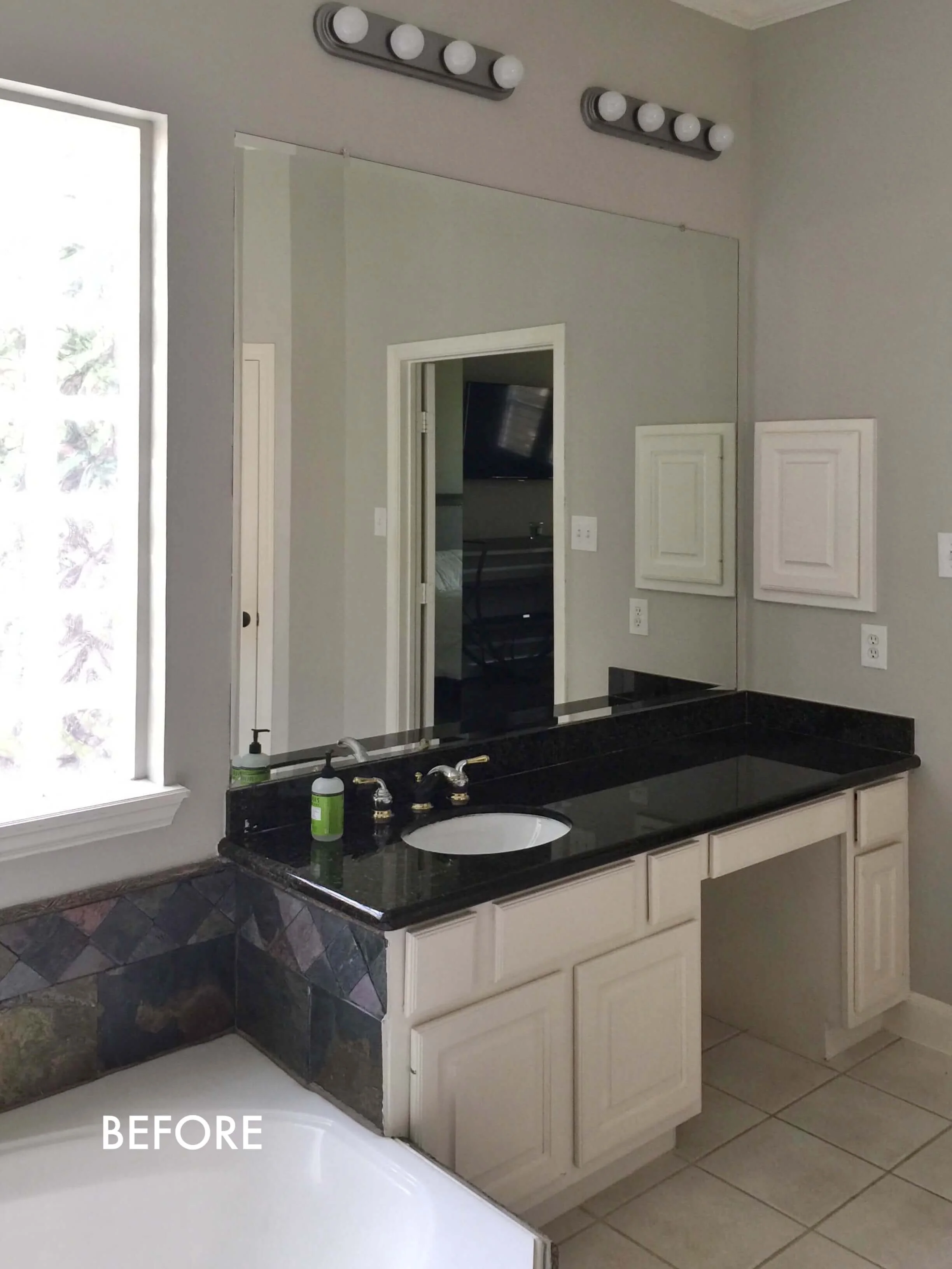 That tile on the side of the cabinetry, the cabinetry, the cheap lighting, the big slab mirror just glued on the wall…..all these are items we wanted to address in this remodel.