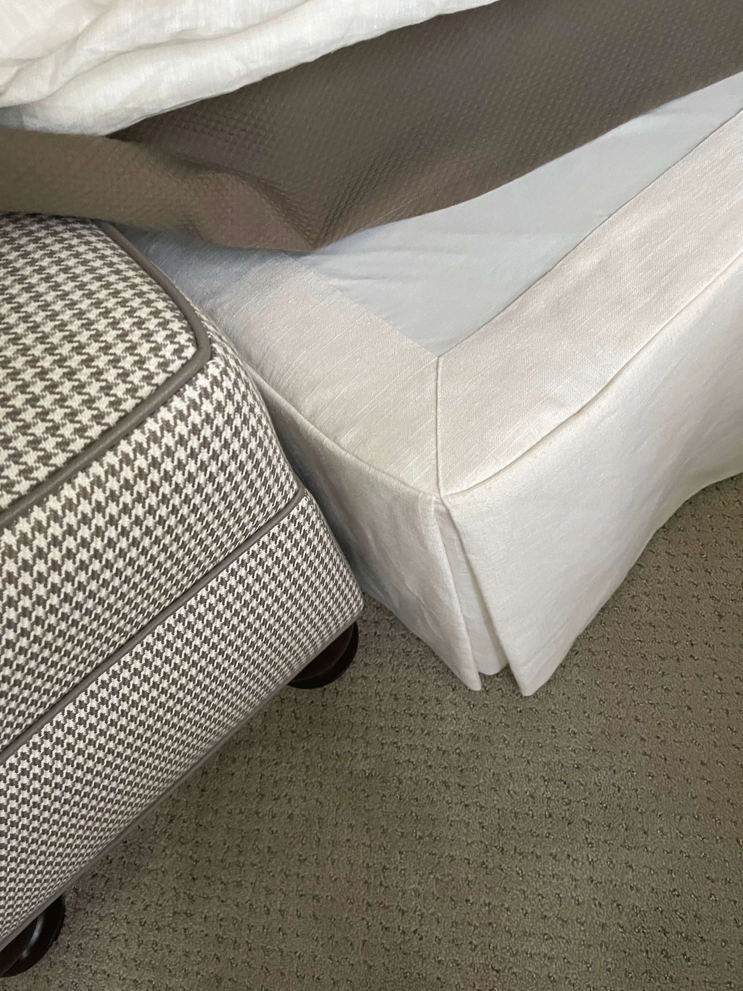 Whenever I’m working on a bedroom project and we have to cut some corners to save on the budget, and we are not doing a full bed, I tell my clients to go for one thing in particular: The skirt.