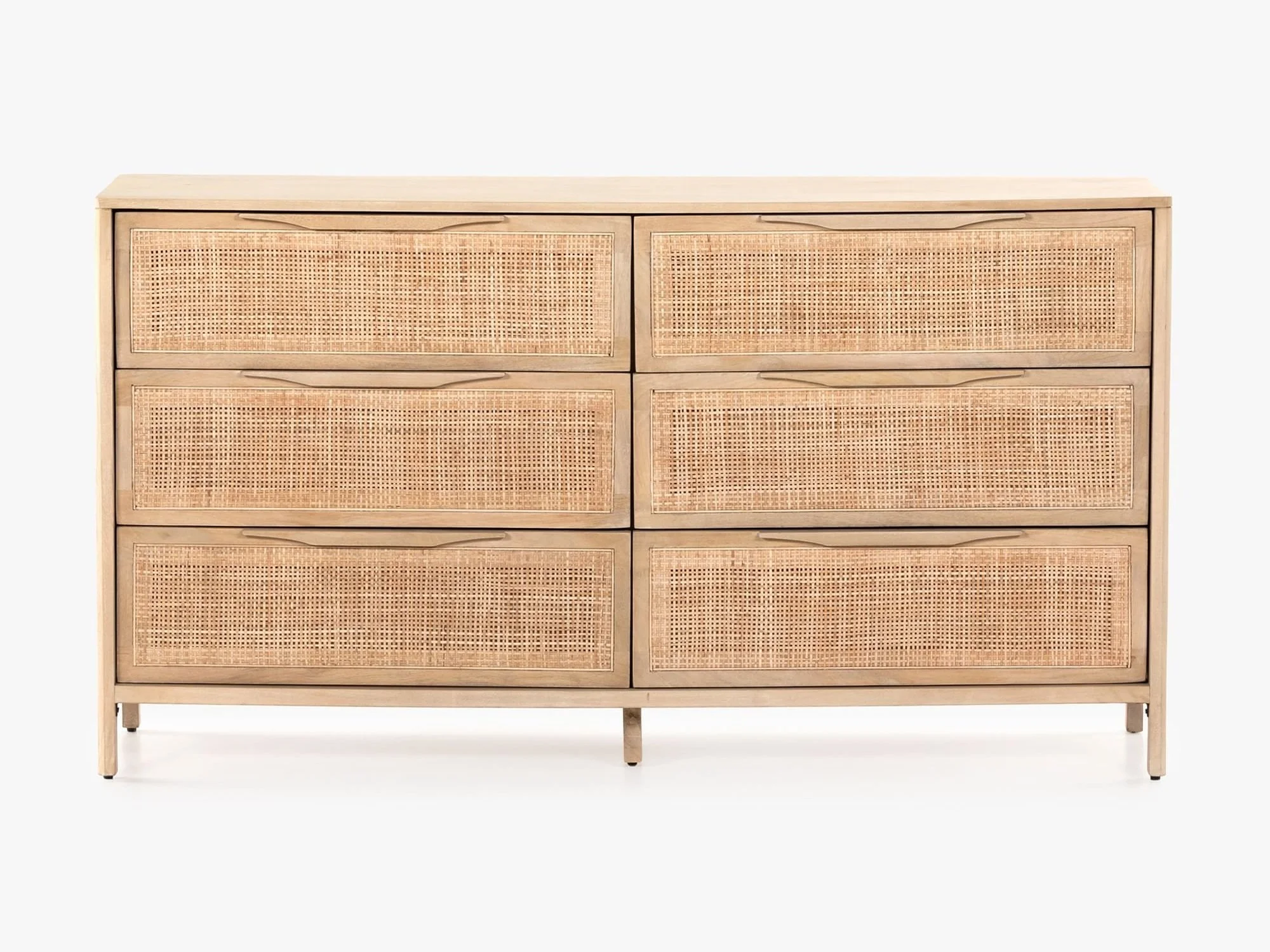 Now we need storage. I like this dresser with the caning on the front. It has a similar light wood color as the nightstand and floor.