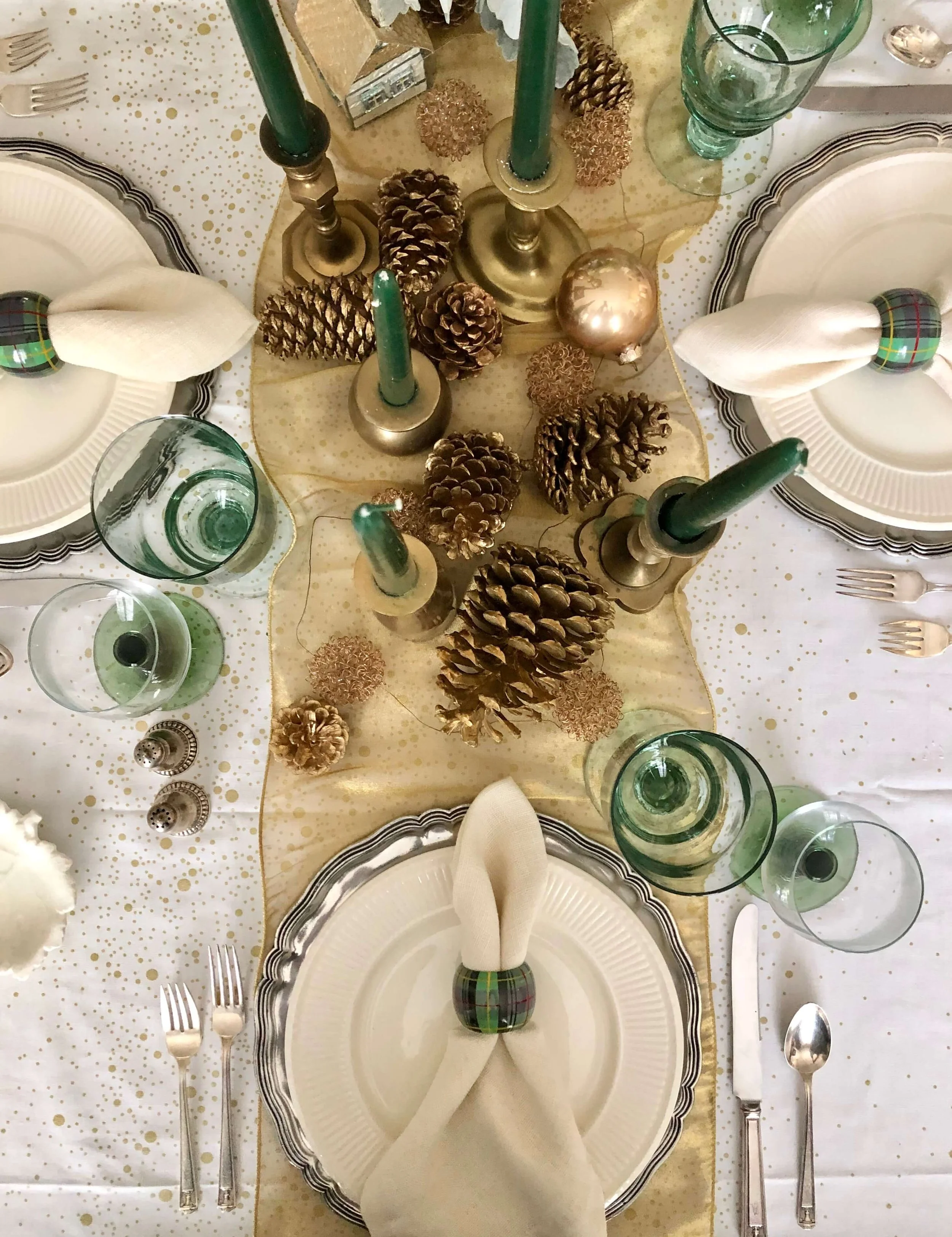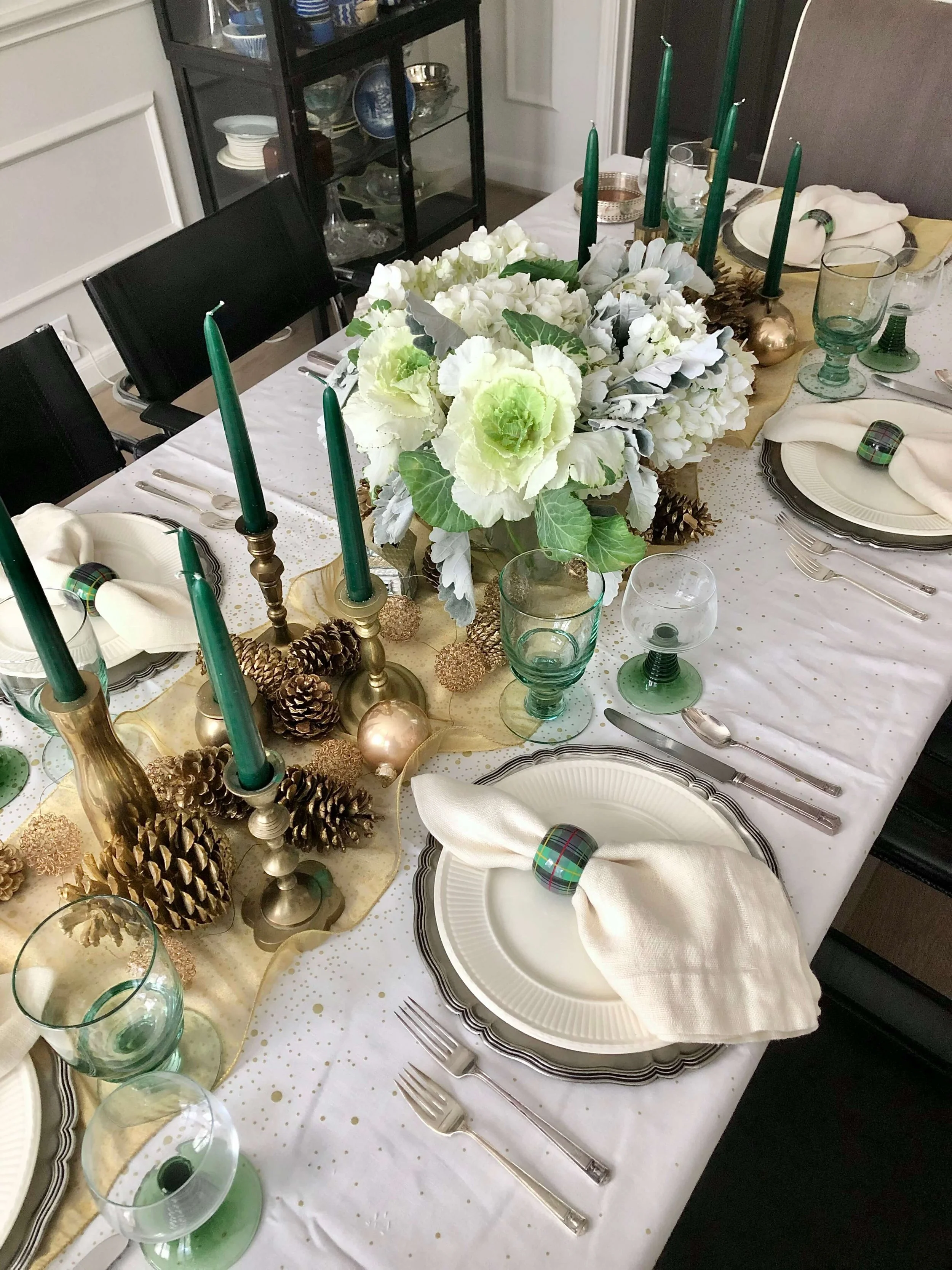 Here I’ve used gold painted pine cones on this wide, wired ribbon runner with my brass candlesticks. Kale and dusty miller create a nice centerpiece that brings in the green I wanted to accentuate.