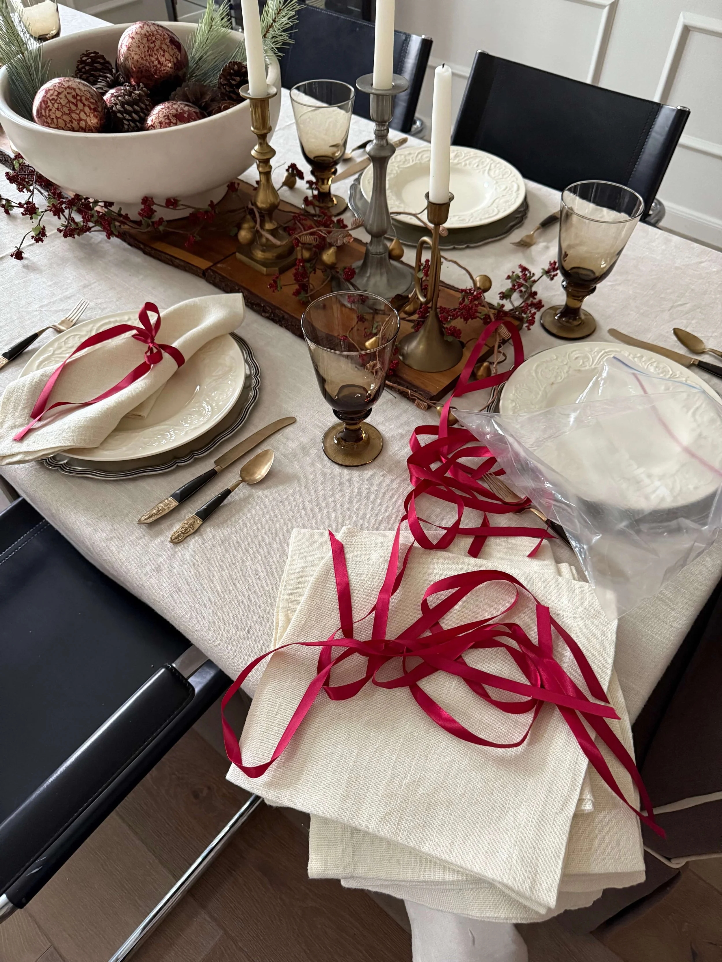 Ever since I saw Martha Stewart do this on the cover of her Entertaining book back in the 90’s, I’ve loved just tying a silk ribbon around a napkin for a simple napkin embellishment.