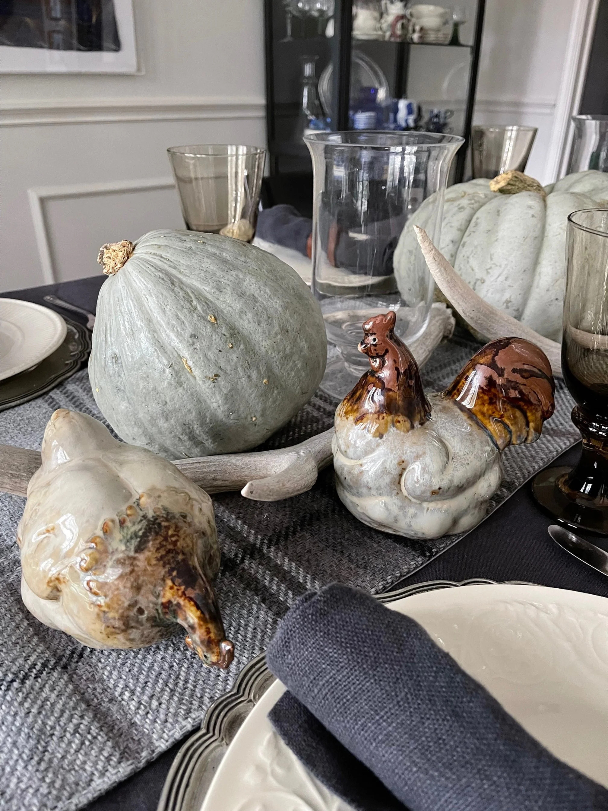 I think adding in some kind of figurine or small decorative item is fun on a tabletop too. In this Thankgiving table I set up one year, I used these chubby chickens that my MIL had handed down to me from her home. They worked with the color scheme and matched the shape of the gourds.