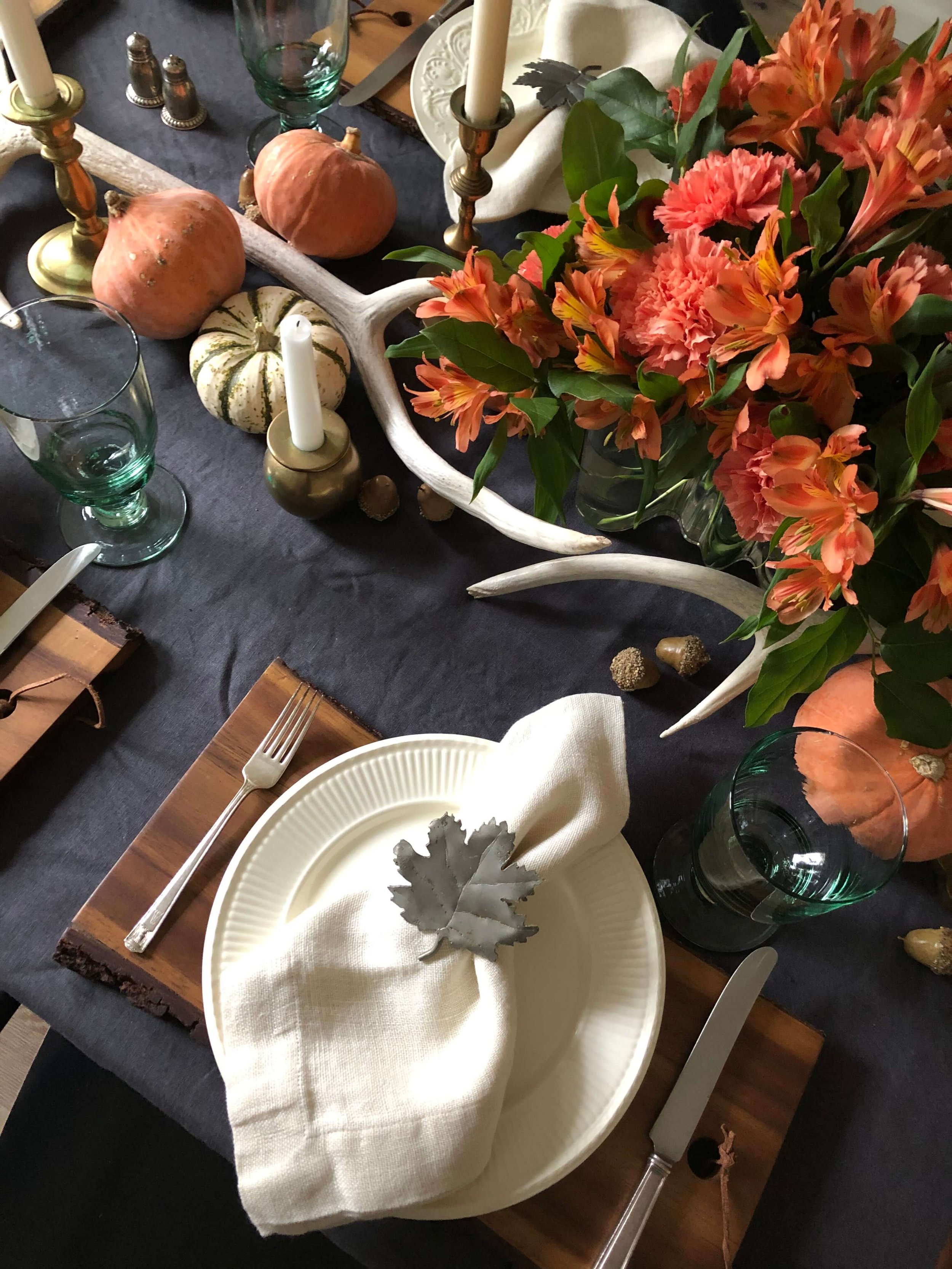 I do like to mix other greens like garlands or just branches and leaves to help create a runner type effect. The three antlers I have also work to create a runner of sorts for a more rustic table and keep things from looking too flat.