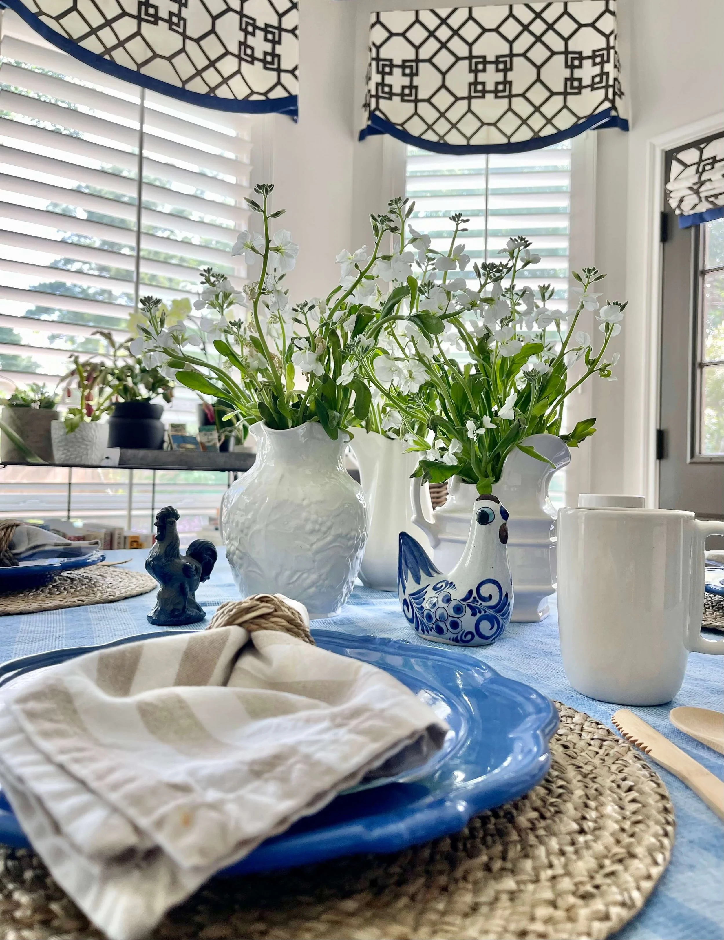 Here’s a July 4th brunch where I used my various cobalt blue and white vases to make a clustered centerpiece.
