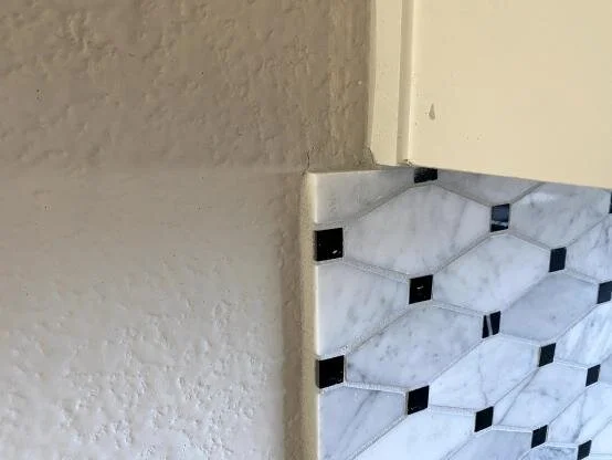 Tile backsplash gone too far - not aligning with the upper cabinet. The unfinished edge is unappealing and feels incomplete too. carlaaston.com