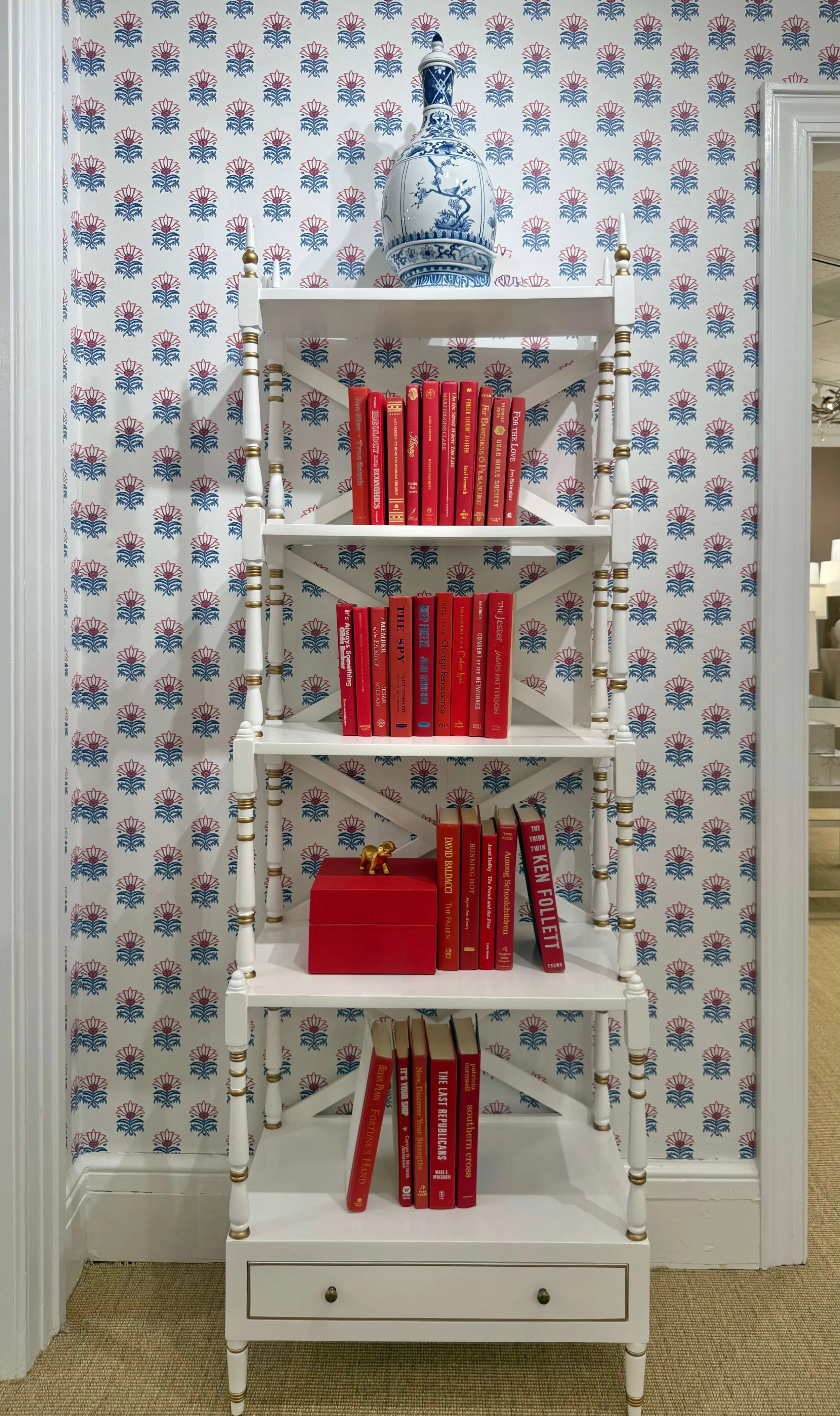 Small patterned wallpaper with a finely detailed etagere seems very Grandma Chic.