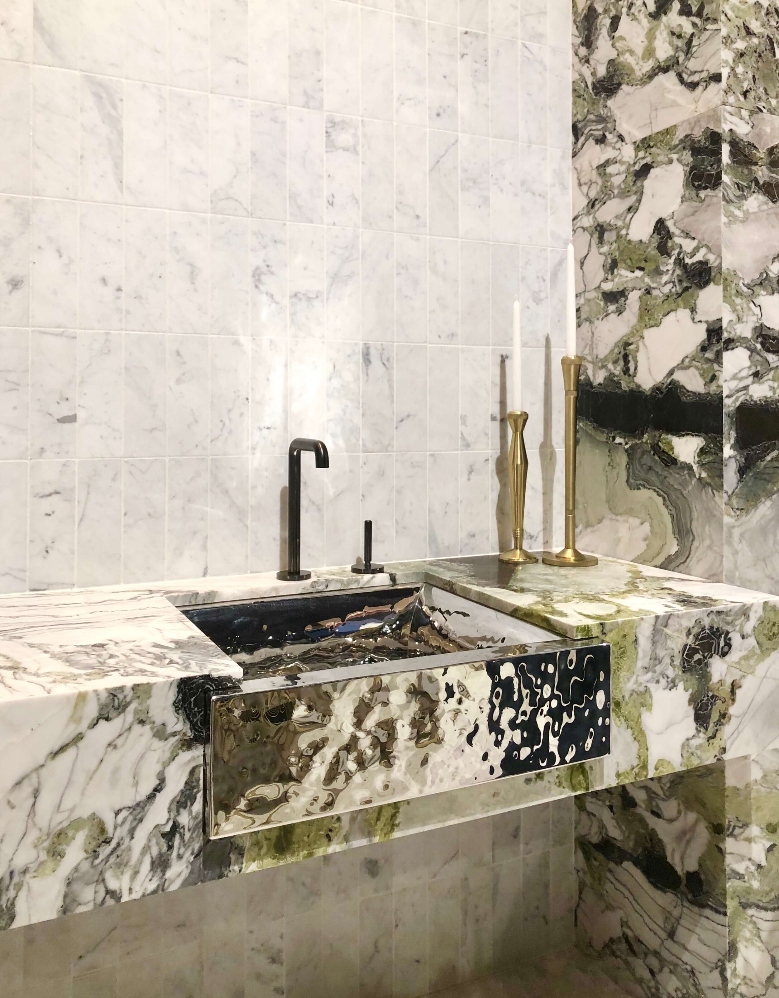 Kallista apron front sink with a hammered mirror-like finish.