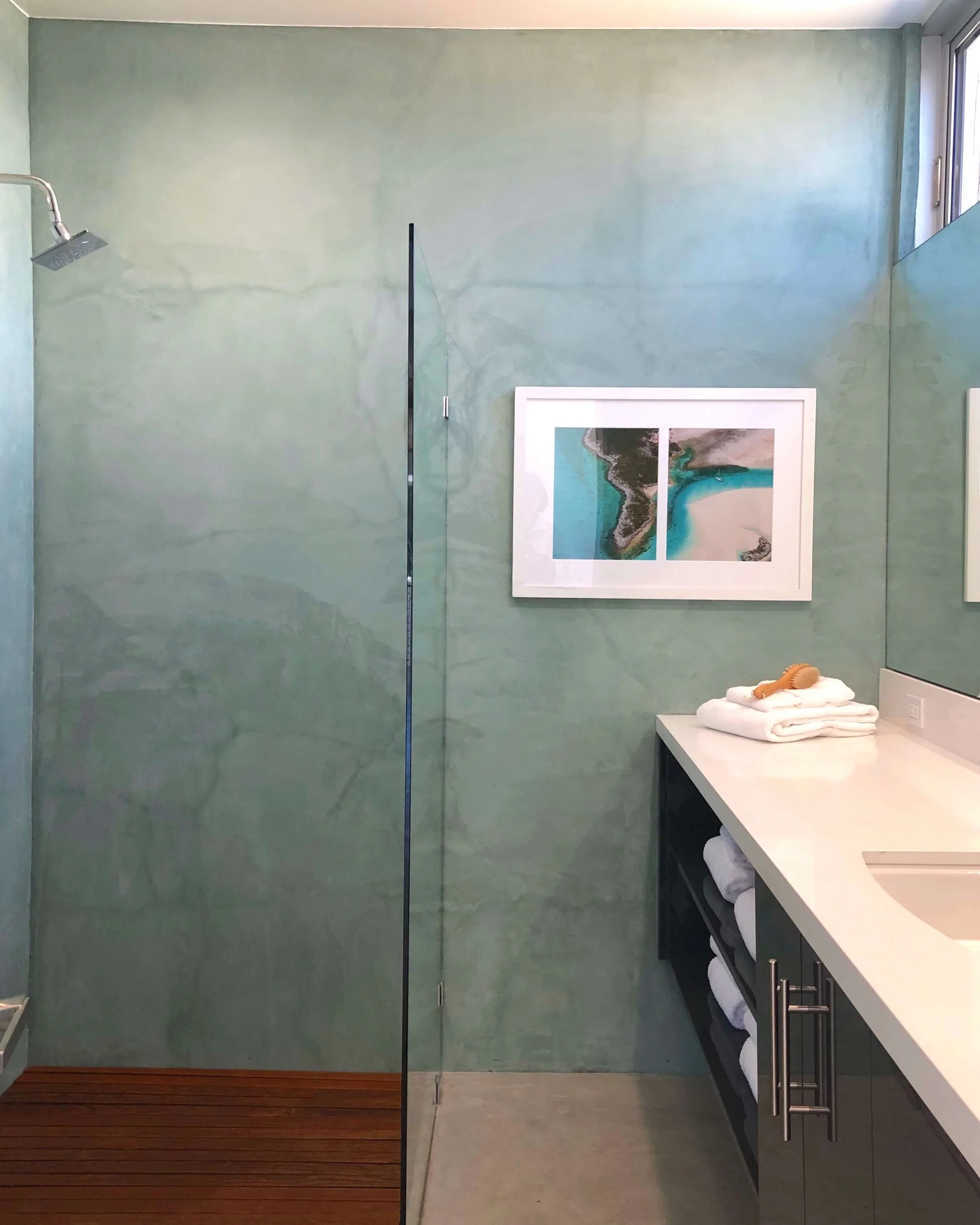 Waterproof plaster walls running through the glass enclosure into the shower stall in this modern bathroom seen on the Dwell on Design Home Tour.
