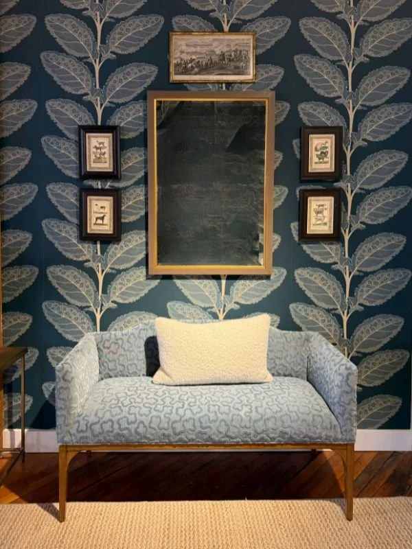 A blue velvet sofa with fringe anchors this seating group at Highland House.