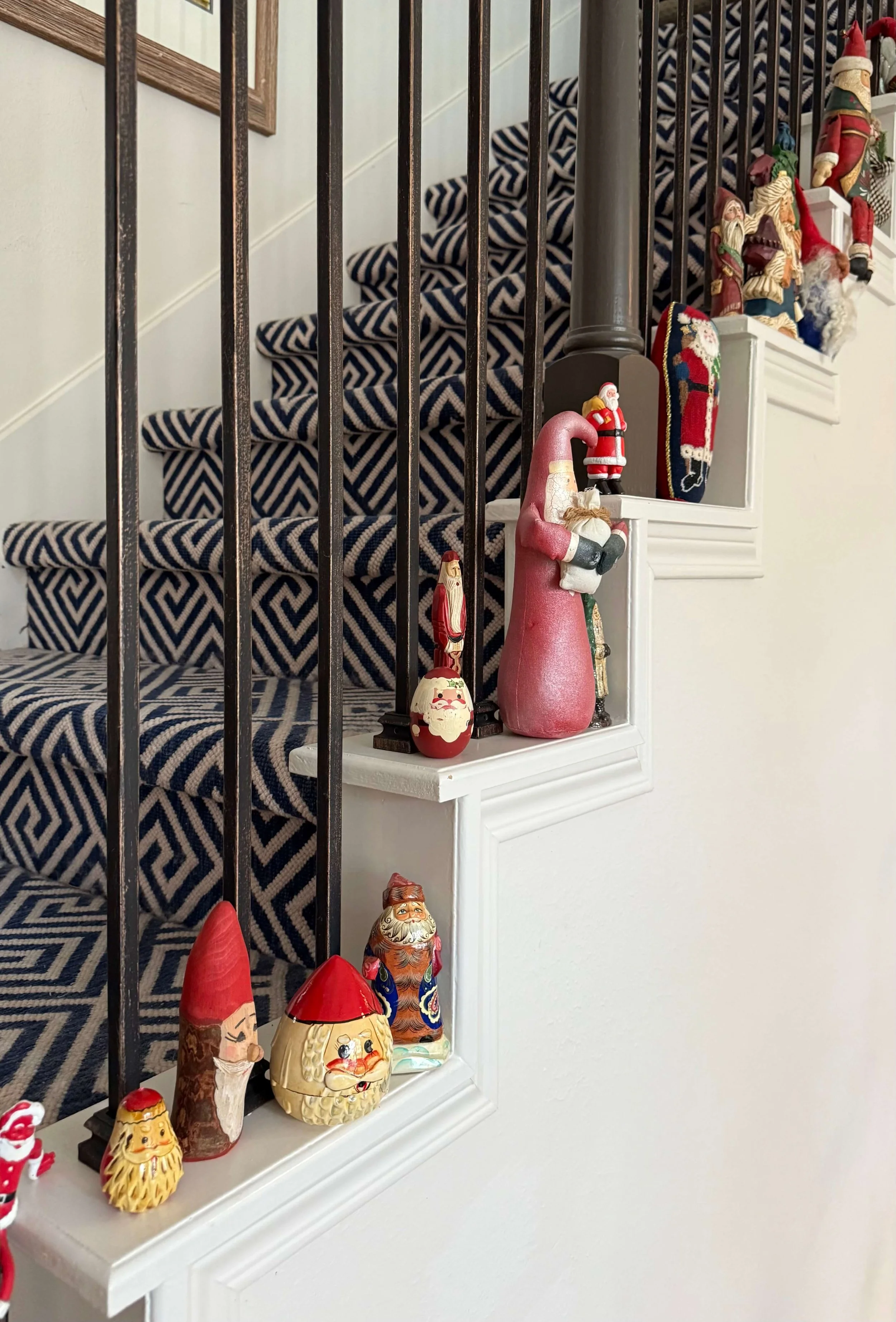 My foyer has the Art Noveau hall tree we brought back from Australia, after living there two years. I decorate it up with a garland, ornaments and Christmas hats.