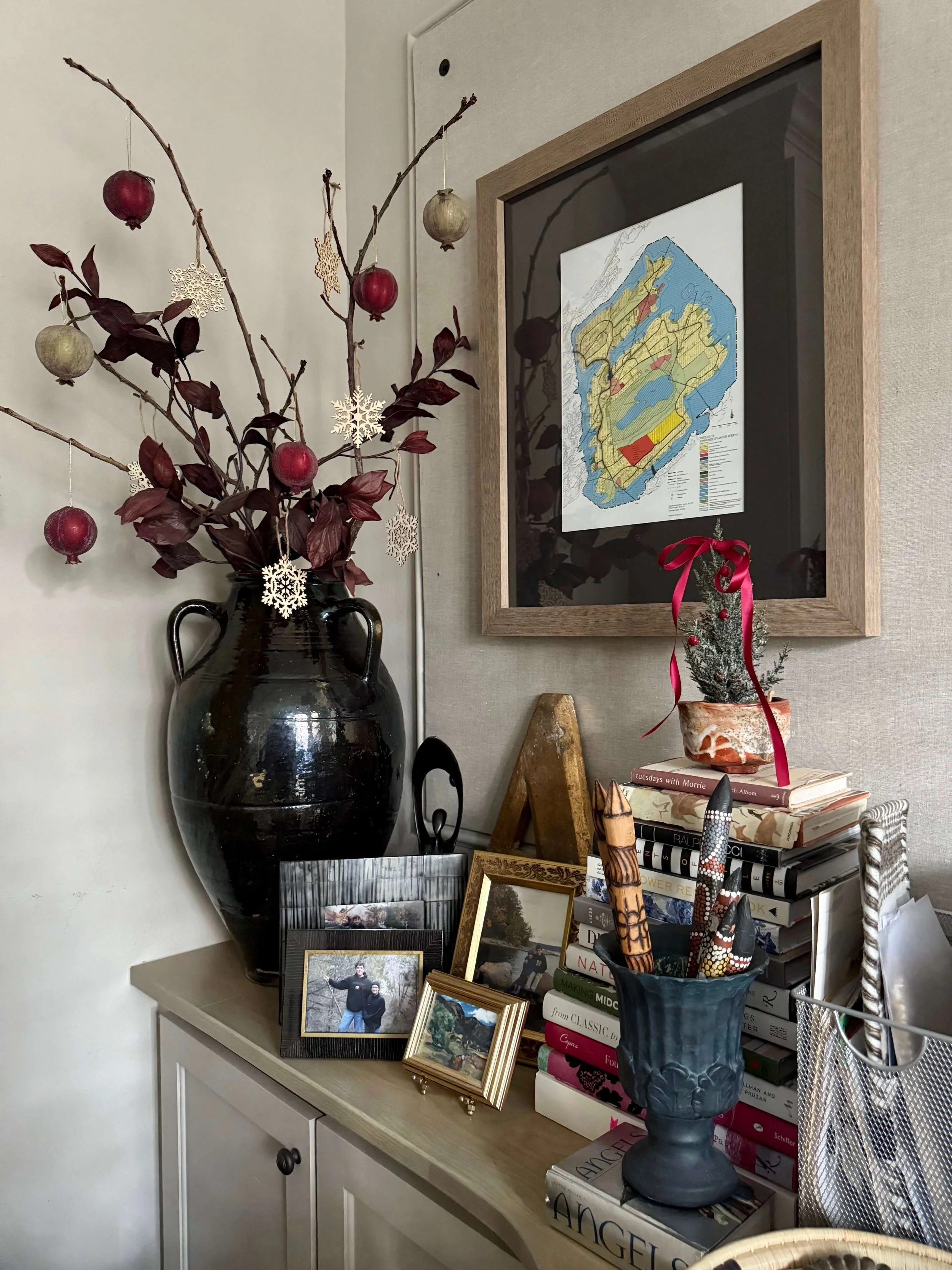 Across from the stair is this little English table where I have faux branches decorated with some pretty ornaments. The mercury glass ornaments were purchased for a Christmas showhouse room I did back in 2015 and the wooden snowflakes were taken in a flat pack in my suitcase to our Christmas in Big Bear, CA a few years ago.