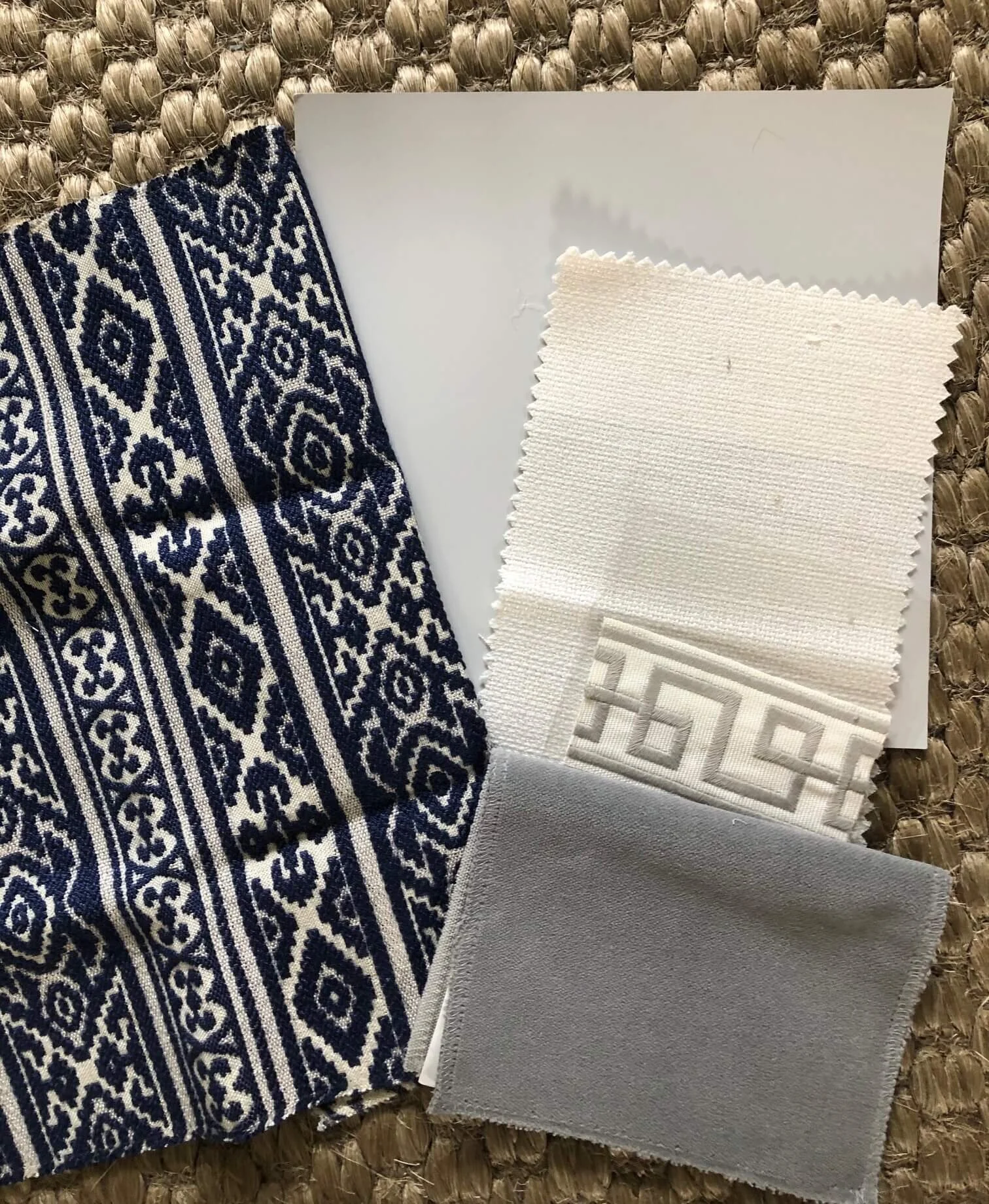 You should really get your fabrics settled, your tape trim, etc. before deciding on the paint color. And make sure you compare the greek key trim to the white woodwork you have on your trim and doors there. Most fabrics are not bright white, so you don't want it to be too off compared to your white woodwork.