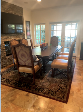 This homeowner had a problem with how to update their dining room, while keeping most of their furnishings and the travertine tile floor as is.