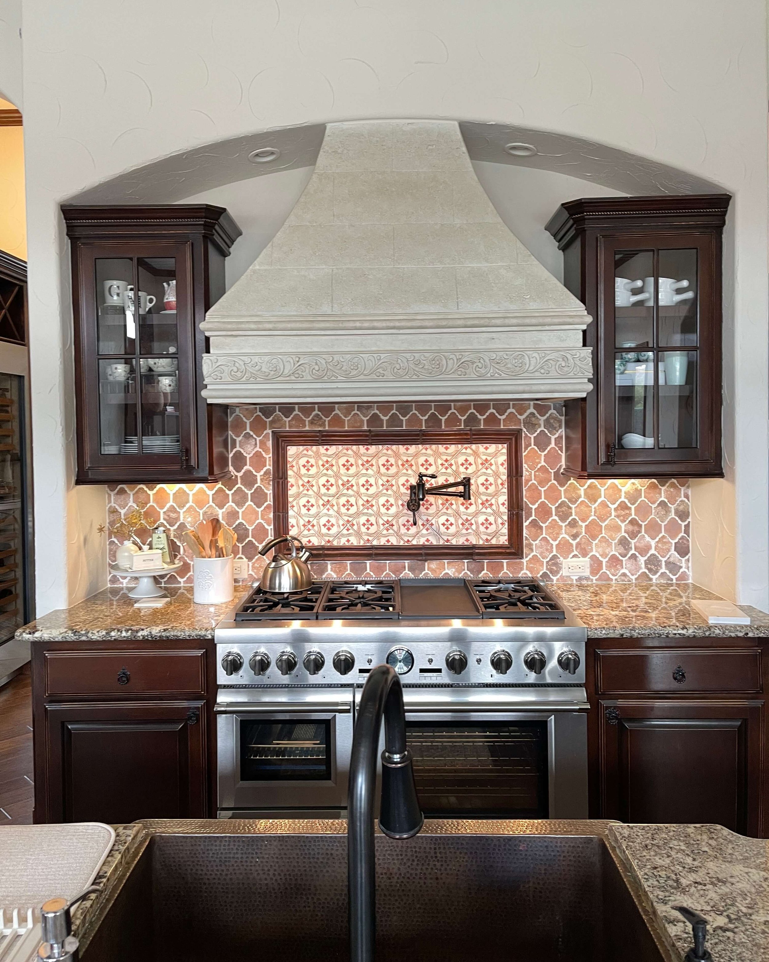 This framed look in the backsplash will be changed out for terracotta tile all over the niche area around the hood.