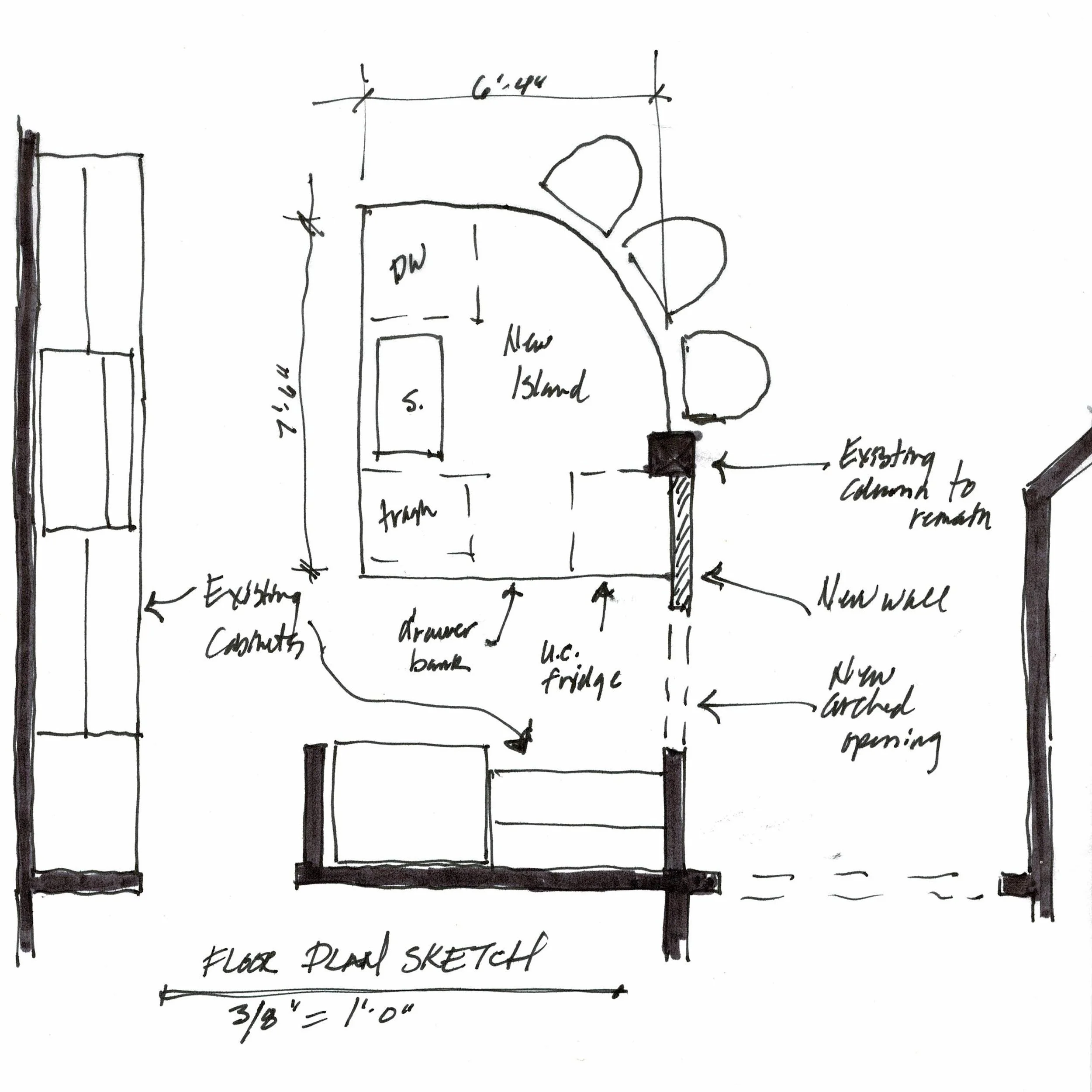 We ended up connecting the column with the wall there by the refrigerator wall with an arched opening and then having the island work as a sort of peninsula off that.