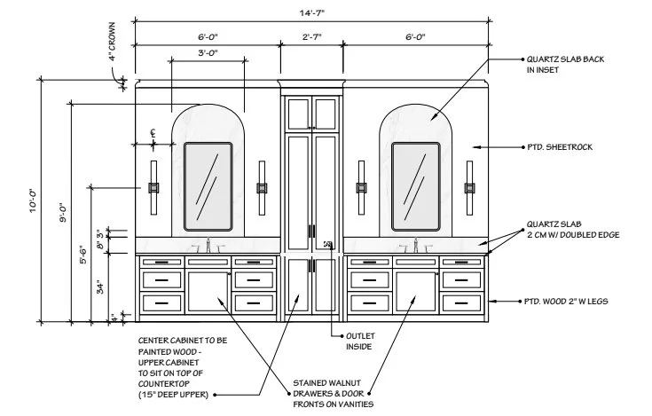 The bathroom vanity will have walnut cabinet fronts at the vanities while the tower will be painted a creamy white to match the walls. That will serve to visually divide the two spaces. I incorporated arches inset into the wall that will be clad in marble tile with brass framed medicine cabinets in the center. I love how this relates to the double arches in the dining room and living room.