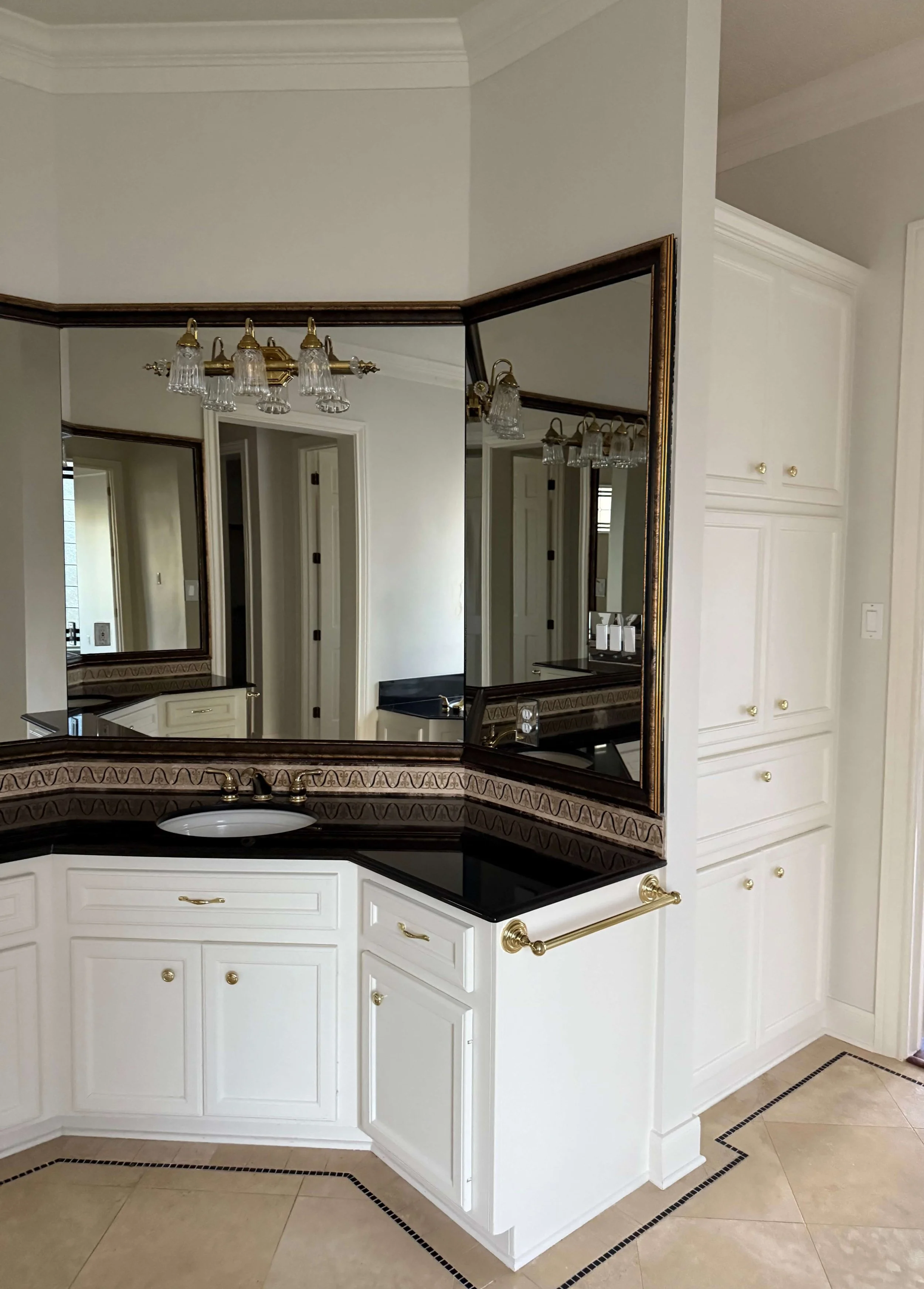 This space looked dated with the huge polished black granite countertop angled around the room and the tile border that jogged around every corner.