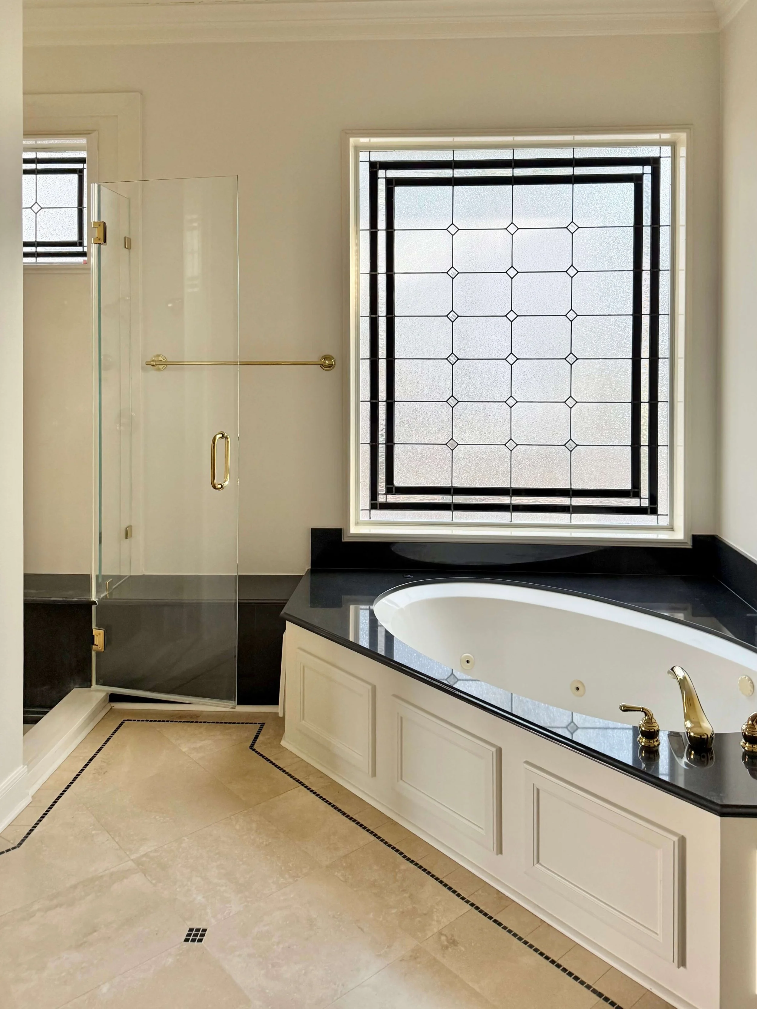 A big corner tub with a stained glass window is another 90’s feature.