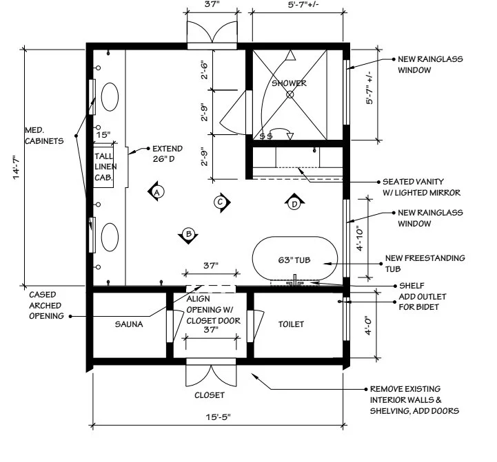 The shower and tub were located on the exterior wall and the opening to the shower with that little hallway there sort of felt like wasted space to me. This was a big bathroom and although we left the plumbing in the same general locations as there was no need to move them, I felt we could rework this area some to work better.