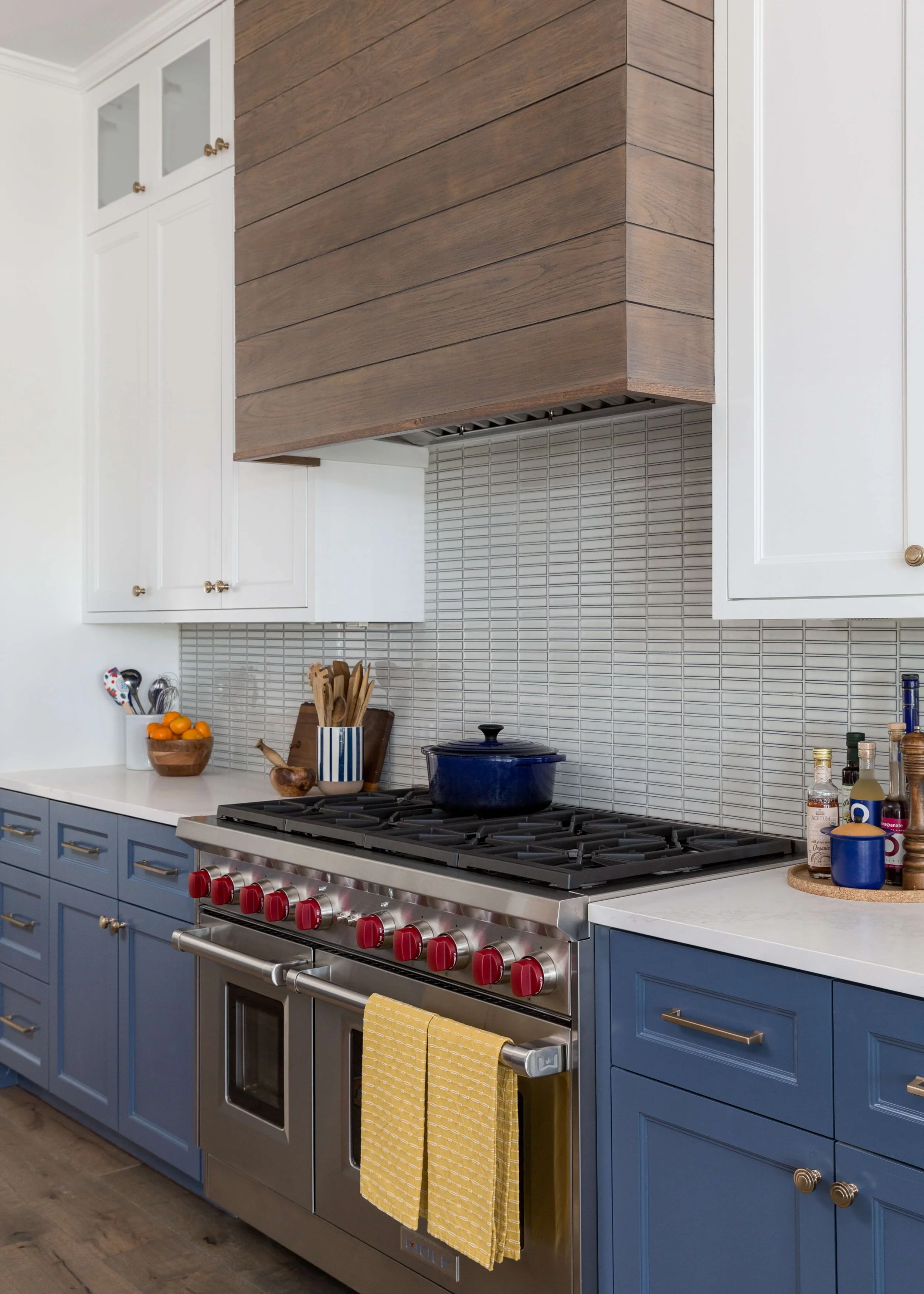 The wood look tile hood material turns the corner and travels back to die on the inside corner at the cabinetry.