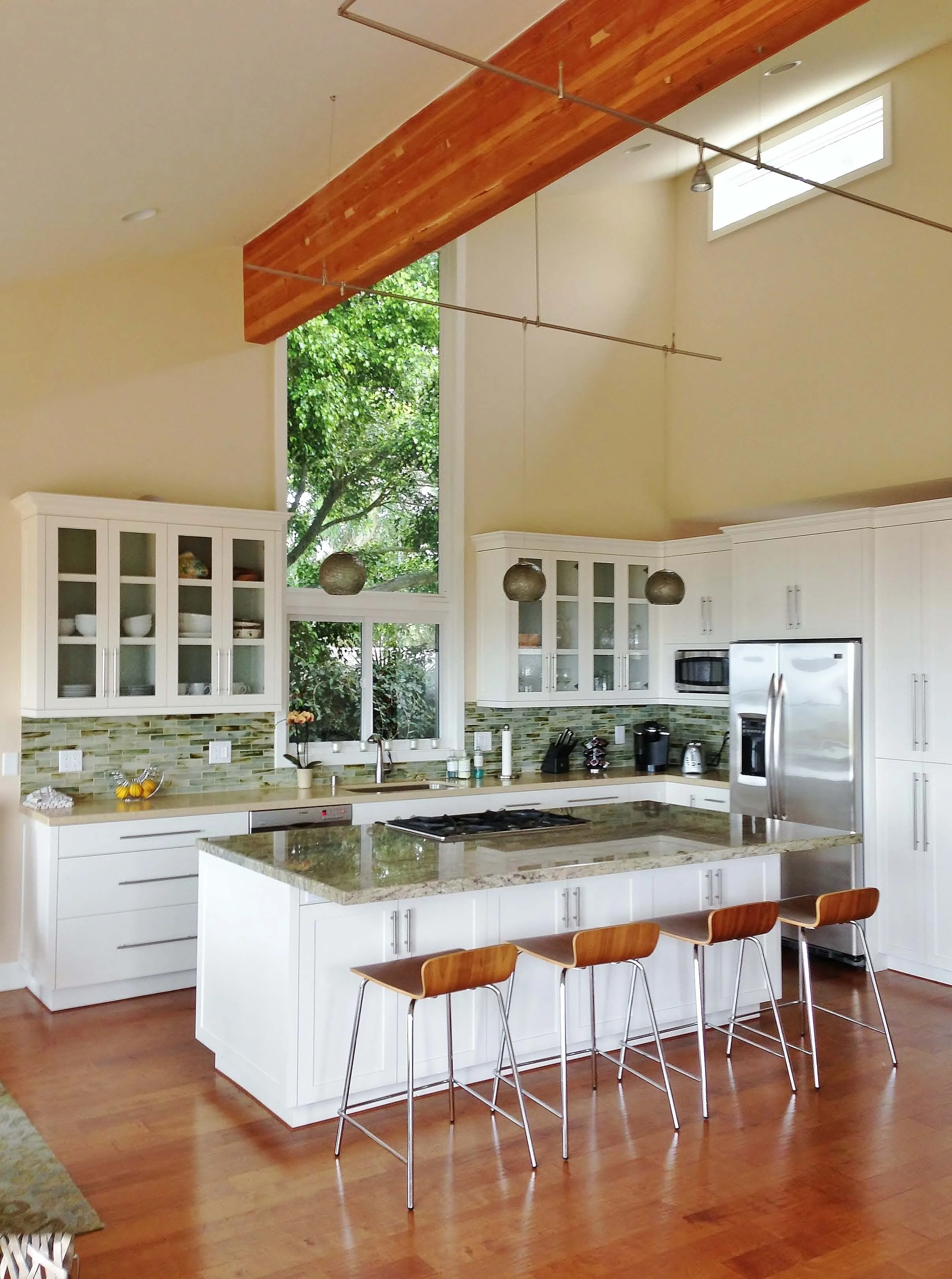 White kitchen cabinets with glass backsplash tile - Ventura California rental house review tour