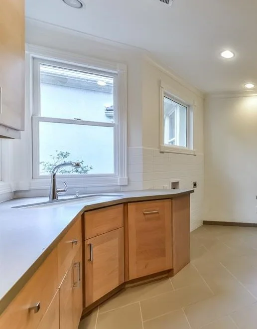 These whitewashed wood finish cabinets are due for painting in 2023 if they are not being replaced.