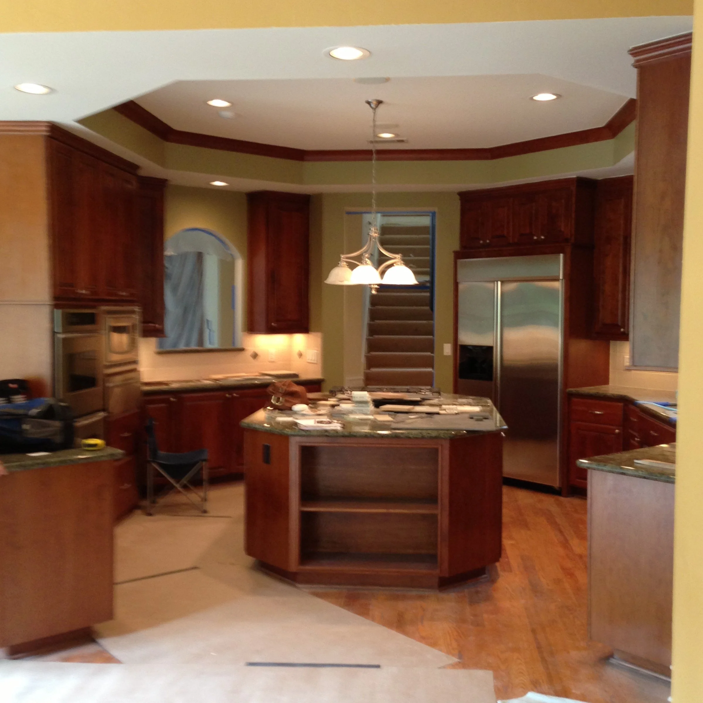 In this case, below, we painted the cabinets and did a new island. We did a new hood, counters and splash too and it looks like a brand new kitchen.